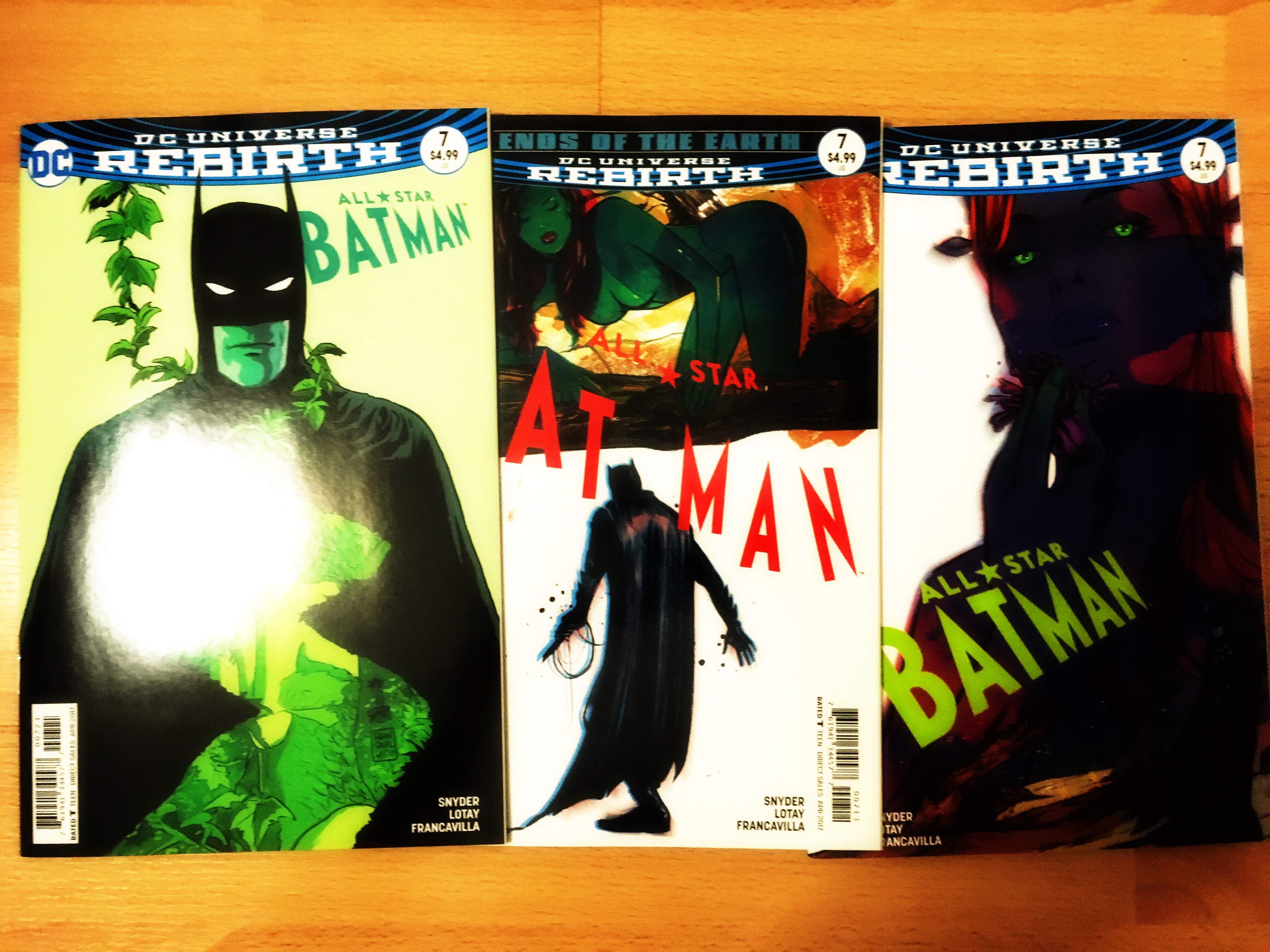 Eine Woche aussetzen und dann nur ein Heft? Lässt er etwa nach? Was soll ich sagen der Rhythmus in dem Hefte erscheinen und dann auch tatsächlich bei mir ankommen, kann stark variieren. Deswegen gibt es in dieser Woche nur ein Heft. Oder doch 3? Nachfolgend seht ihr die Cover zum 7. Teil von Scott Snyders Batman-Geschichten mit wechselnden Künstlern. Dieses Mal dreht sich alles um Poison Ivy gezeichnet von Tula Lotay. Es gibt zwei Cover von Tula und eines von Francesco Francavilla.